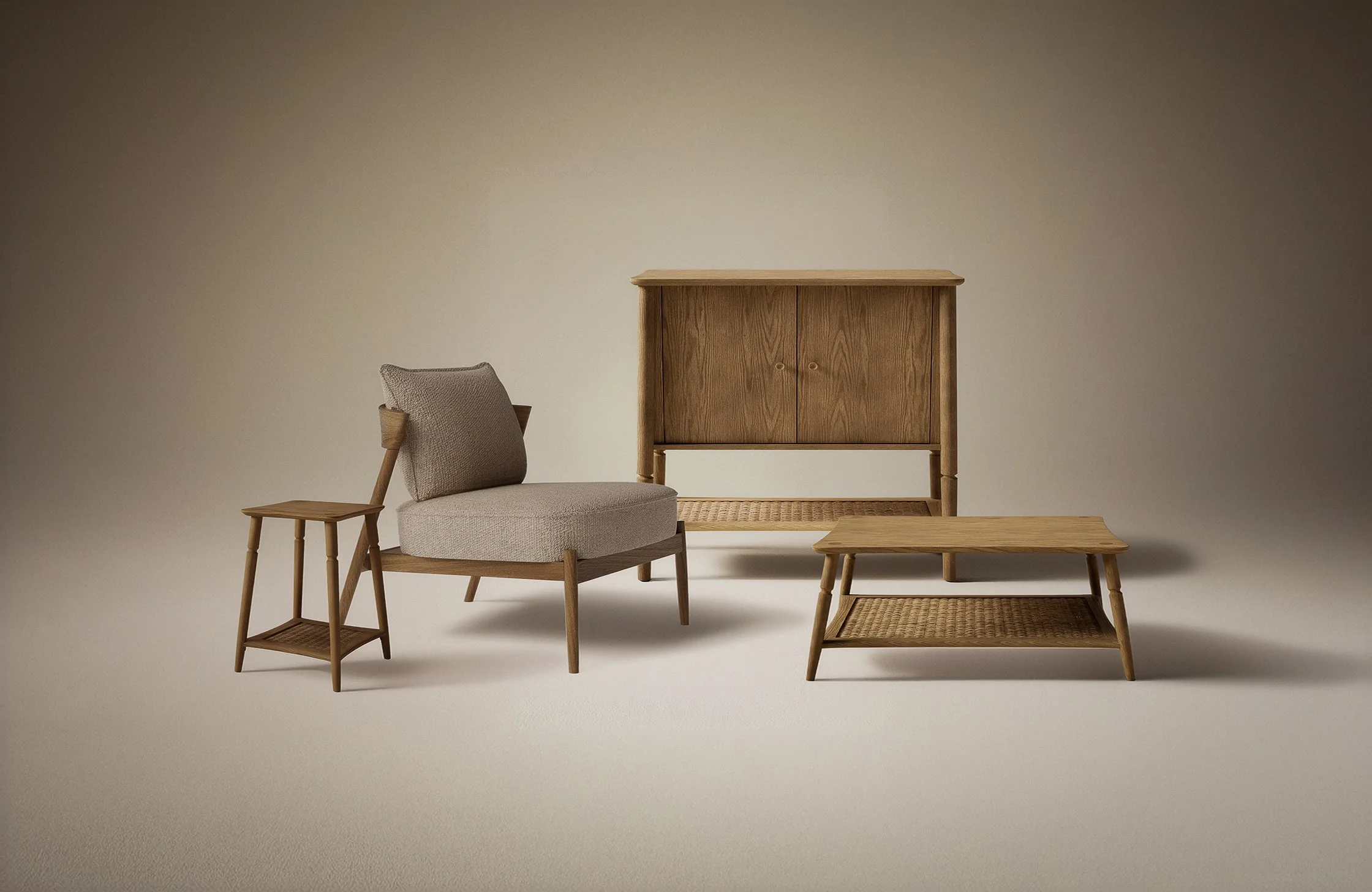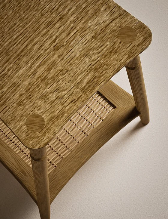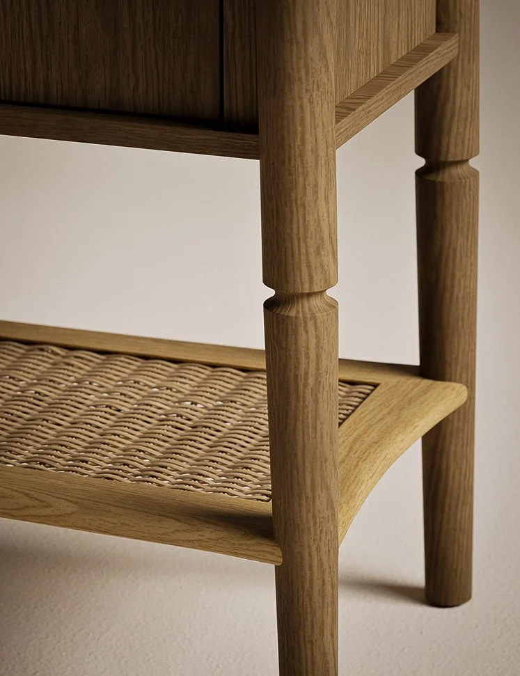 Inspired by traditional British furniture, this classic spindle range, has a turned leg detail which offers a sense of familiarity, whilst the woven shelves add a crafted touch.
