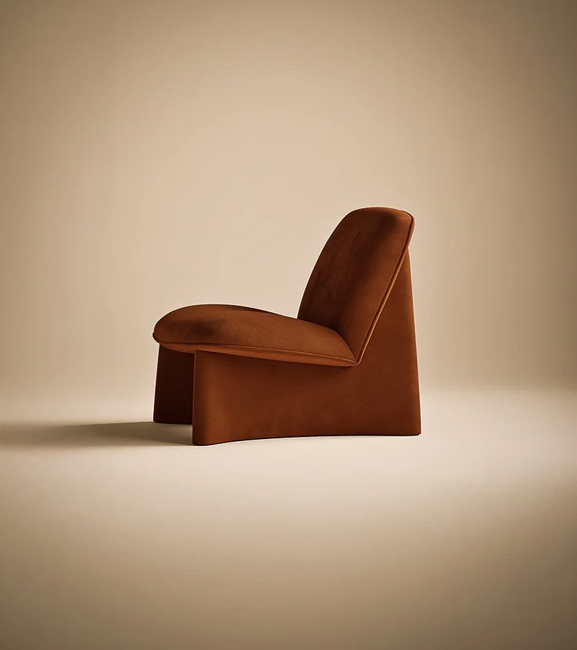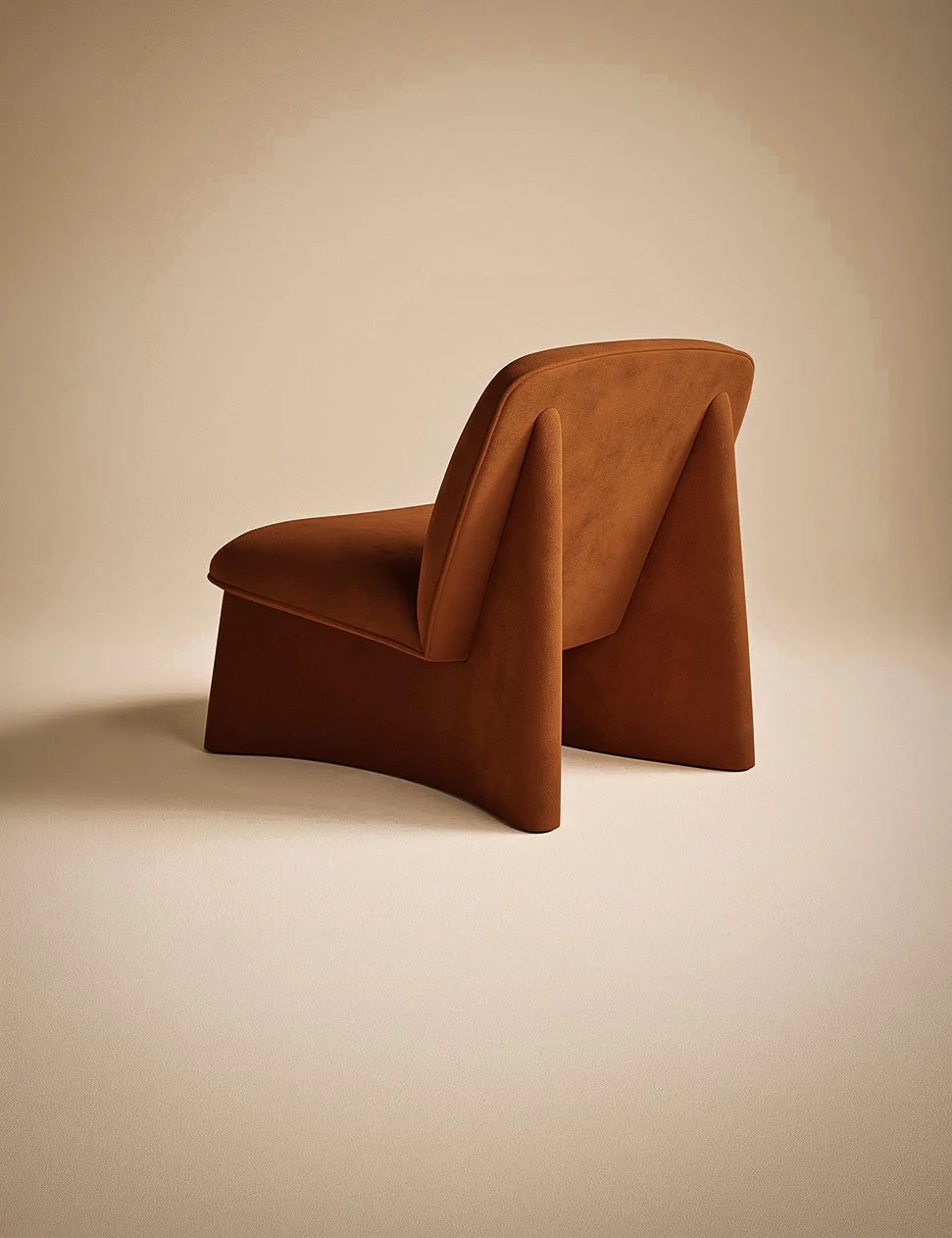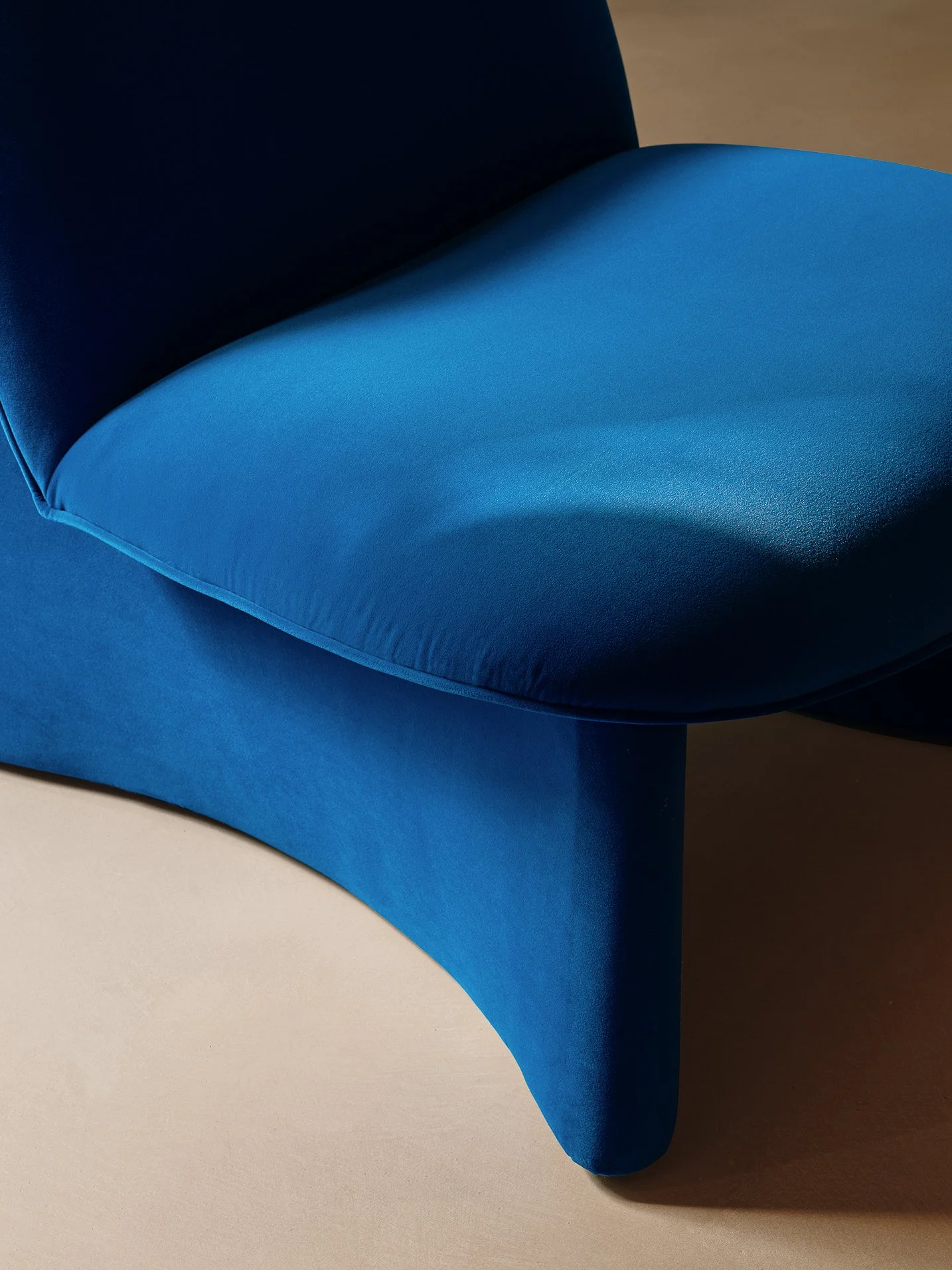 A fully upholstered, contemporary slipper chair, with an arched, tapered leg profile, and piped seam detail.